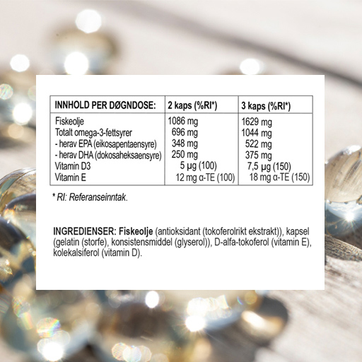 Omega-3 + D og E vitaminOmega-3 er godt for hjerte, hjerne og syn. I tillegg har vi tilsatt vitamin D som bidrar til immunforsvarets normale funksjon, og vitamin E som bidrar til å beskytte cellene mot oksidativt stress